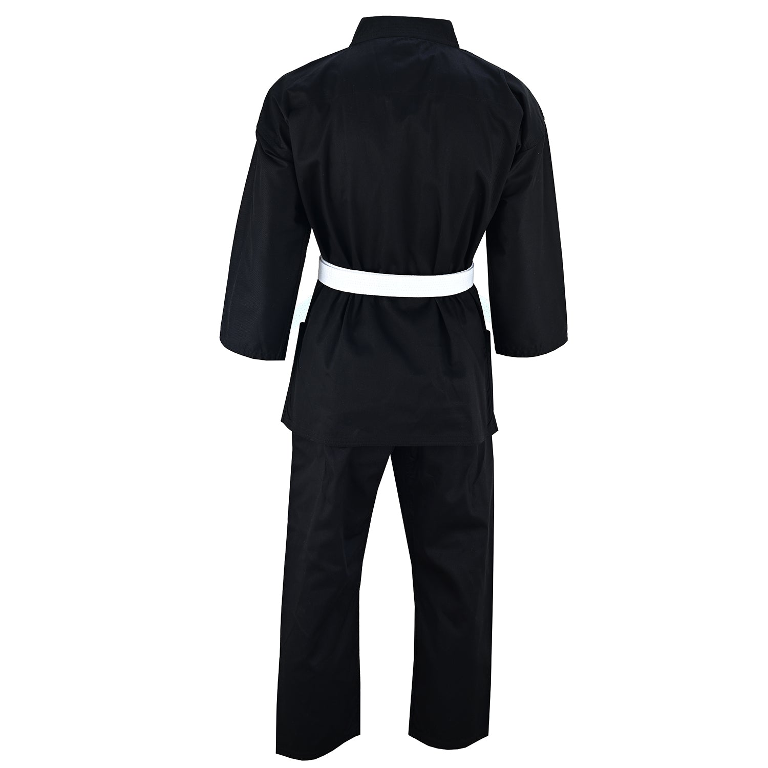 Adults Karate Black Cotton Suit. Medium Weight. 8.5oz. 100% Cotton. Complete with white karate Belt. Trousers with Elastic and Cord Waist for all sizes.