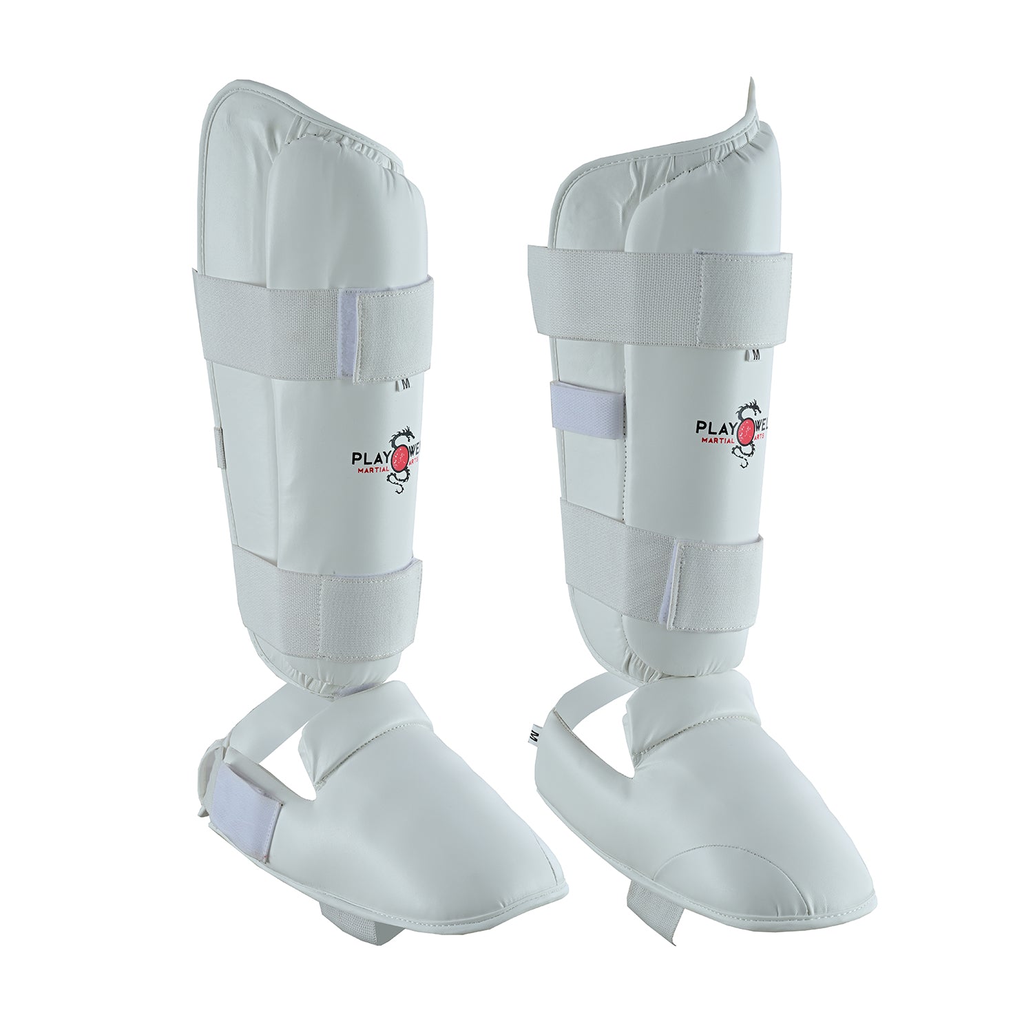 WUKF Style White Karate Competition Shin Guards, Ergonomic shape designed with a natural curvature that moulds naturally for maximum comfort and security. Double stitching and reinforced elastic for added strength and quality Removable foot protector